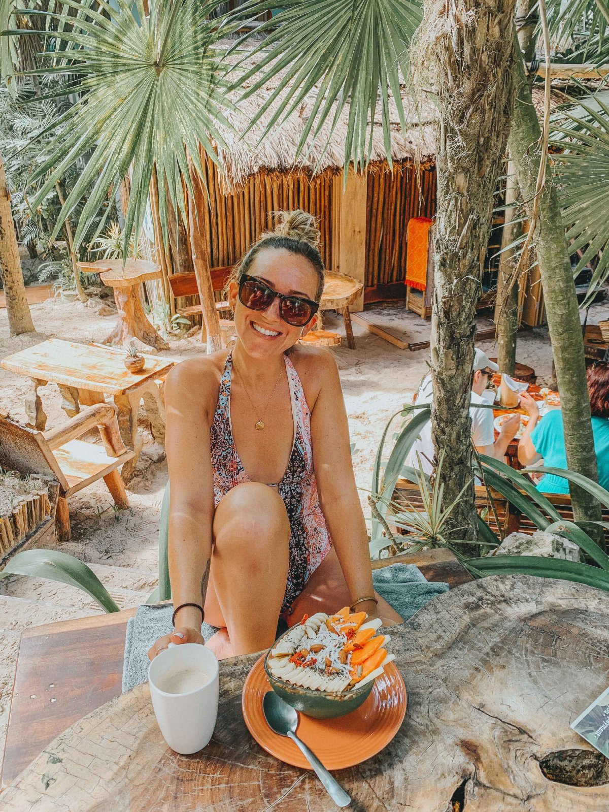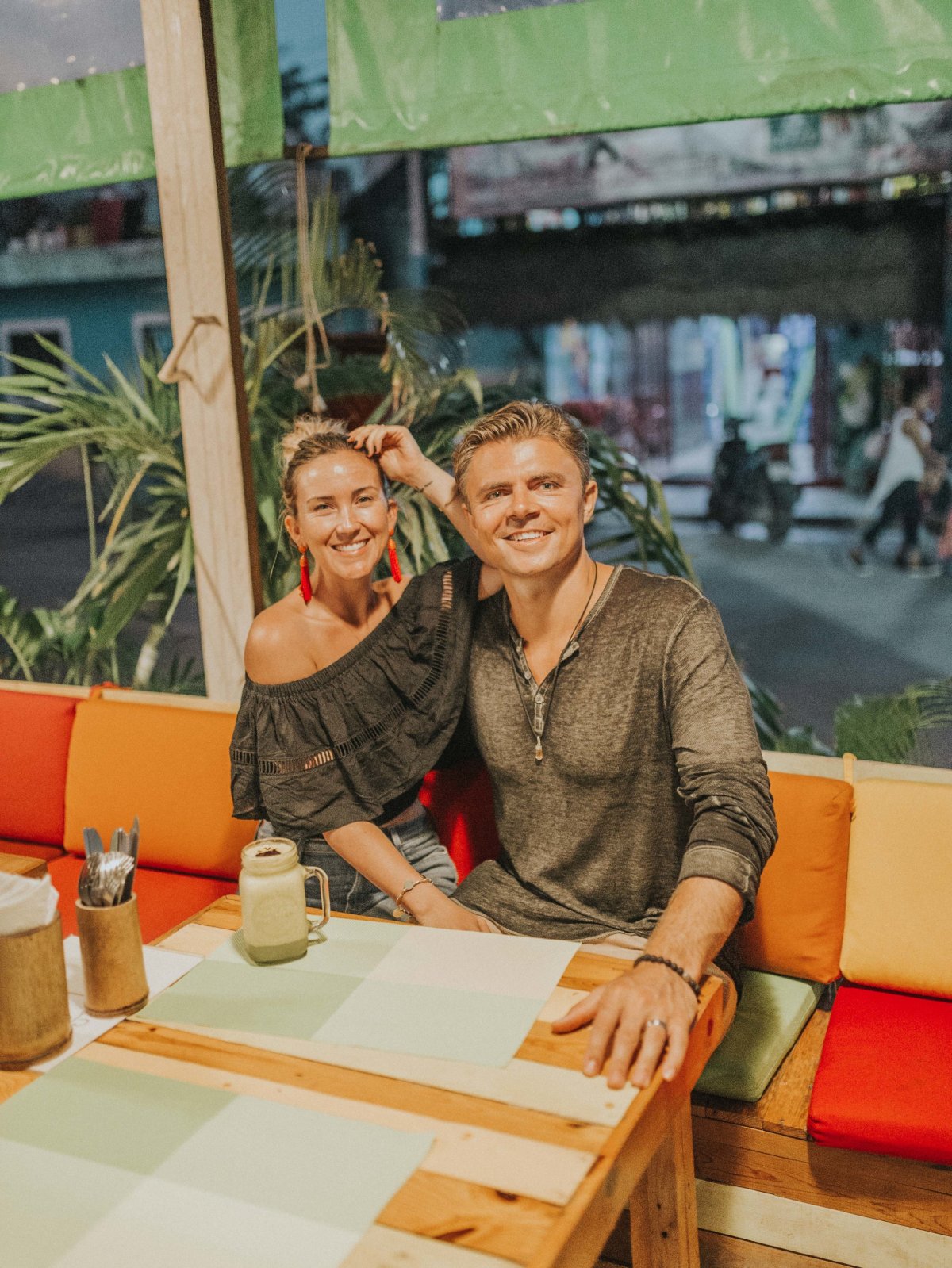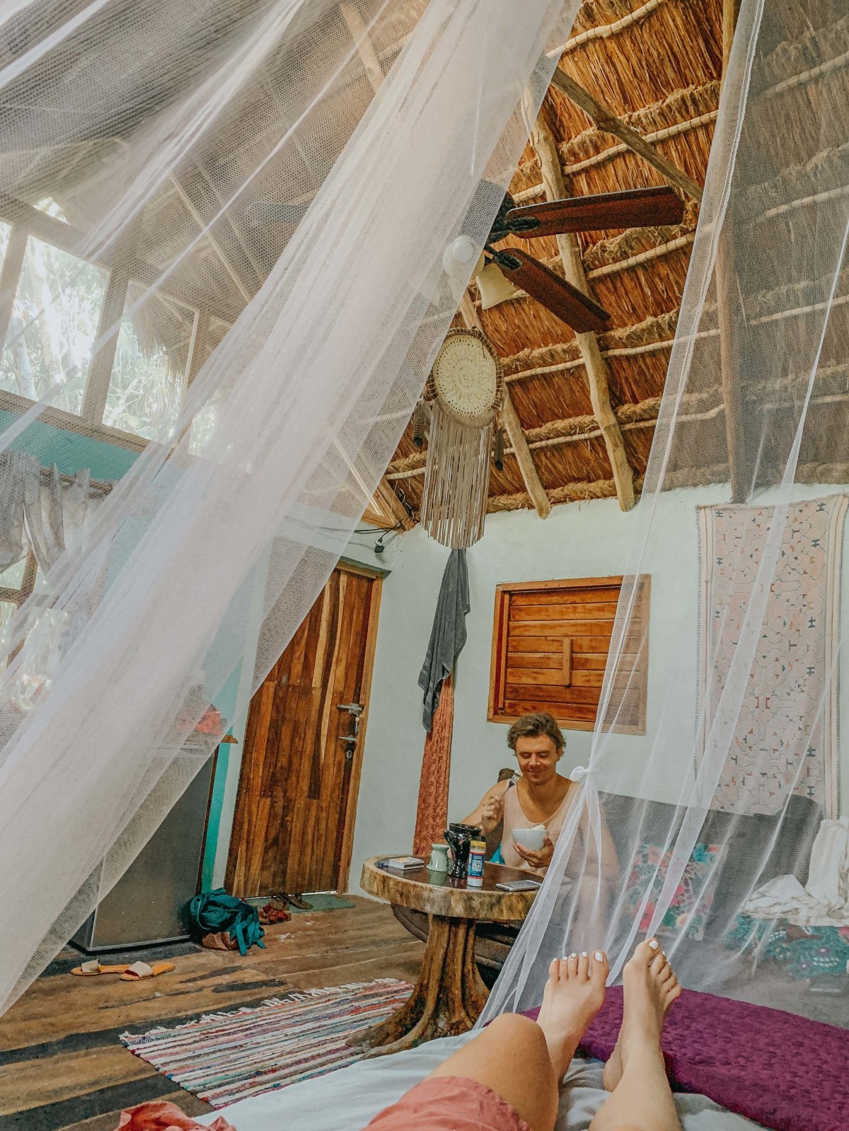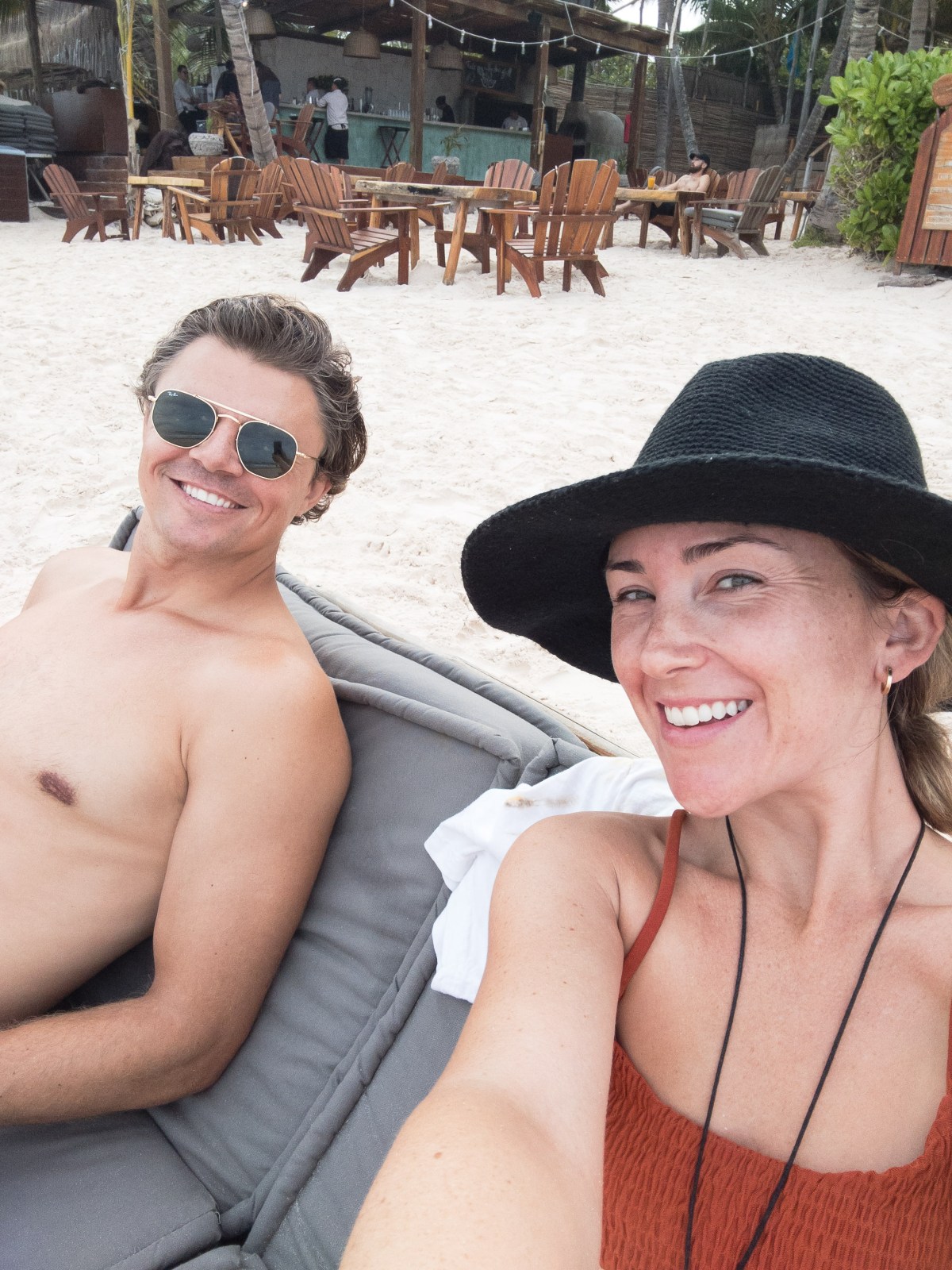 Tulum was our next target, and a place we had heard good things about before we left the US and continued hearing along the way. Tulum is often compared to Sayulita on the West side of the country and we could see the similarities in culture, but they are also very different. The town of Tulum is about 4 miles from the beach, and we wanted to be near the beach but accommodations down there were well out of our price range. We located a bungalow across the street from the beach. It came with free breakfast at the vegan restaurant at the hotel, so we took a risk on another “bungalow” and booked it. After booking we read a warning about noise all through the night from the adjacent bar and jungle bug in the bungalow, but we nervously held our optimism. We lucked out! The bungalow was perfect for us, a studio with a kitchenette and outdoor shower, and importantly, wifi. We settled into Tulum life on the beach, getting sunburned and partying with honeymooners. While gorgeous, and full of nice shops and great restaurants Tulum was priced similarly to prices in the US and we recognized how spoiled we’d become when our glasses of wine at a restaurant were $10. Each!!