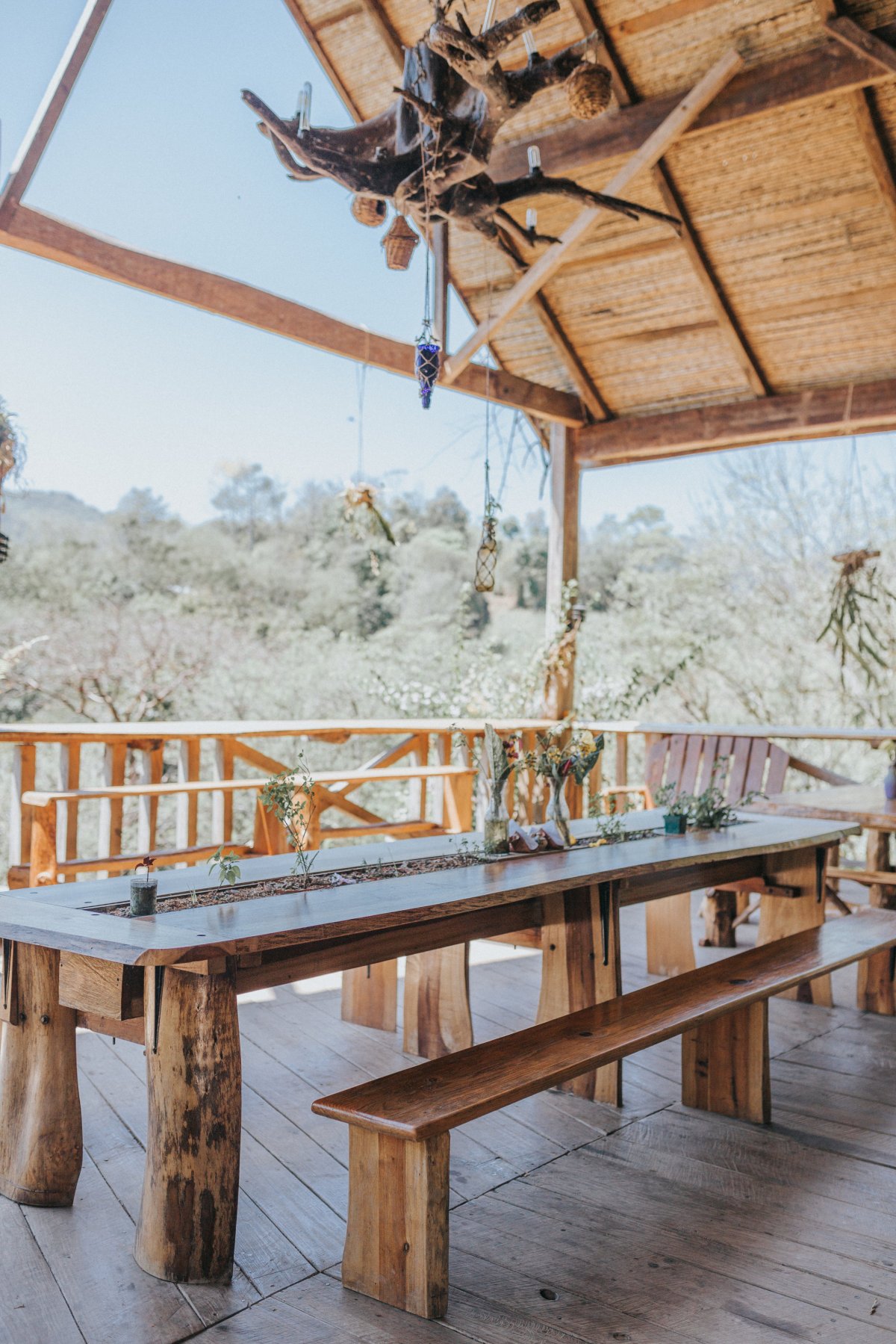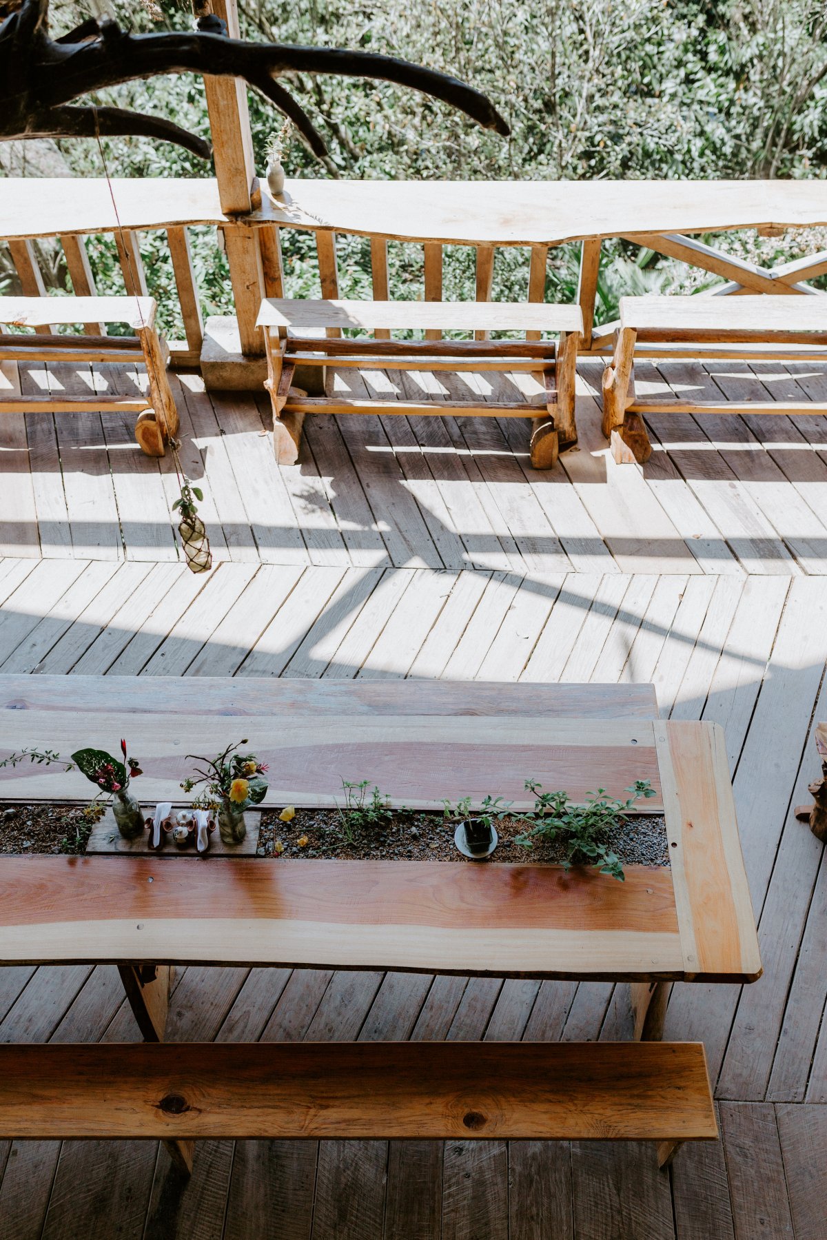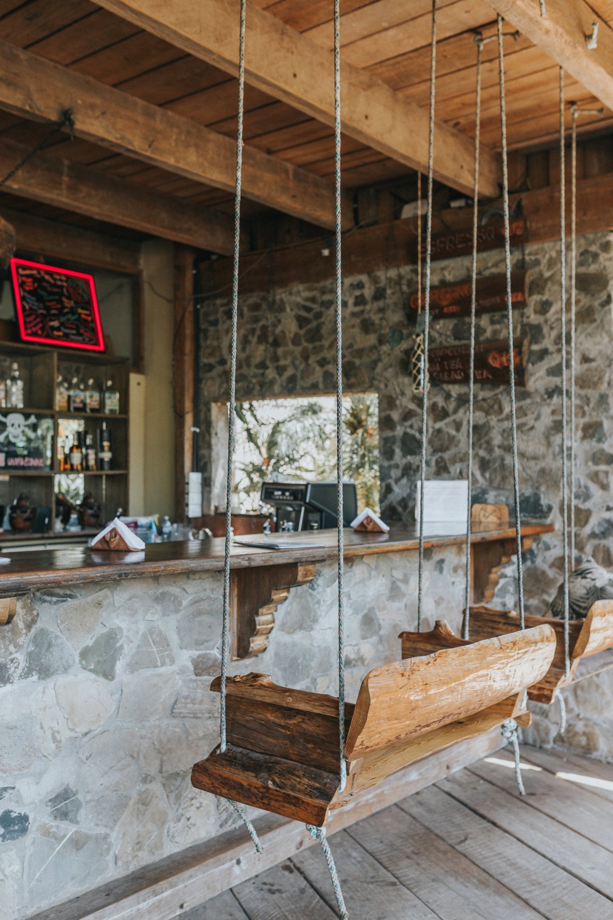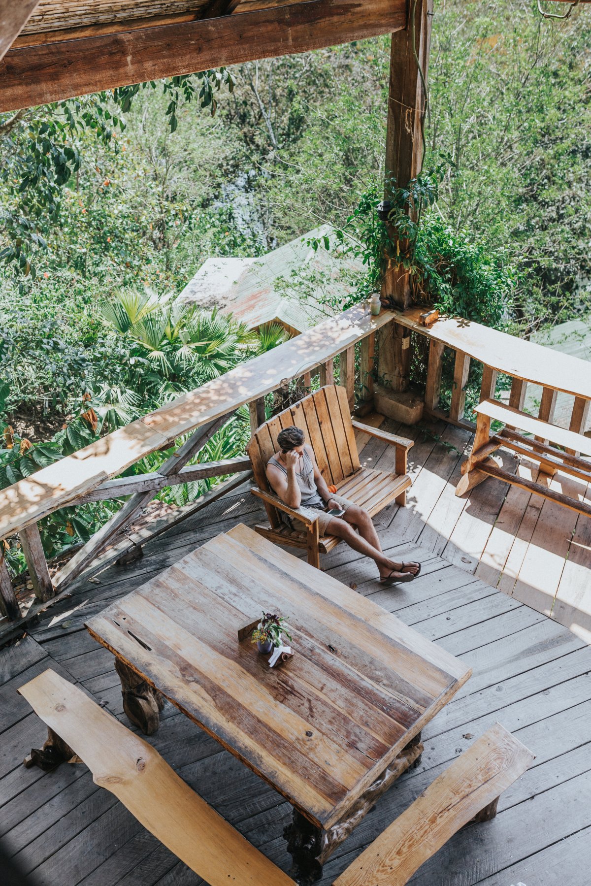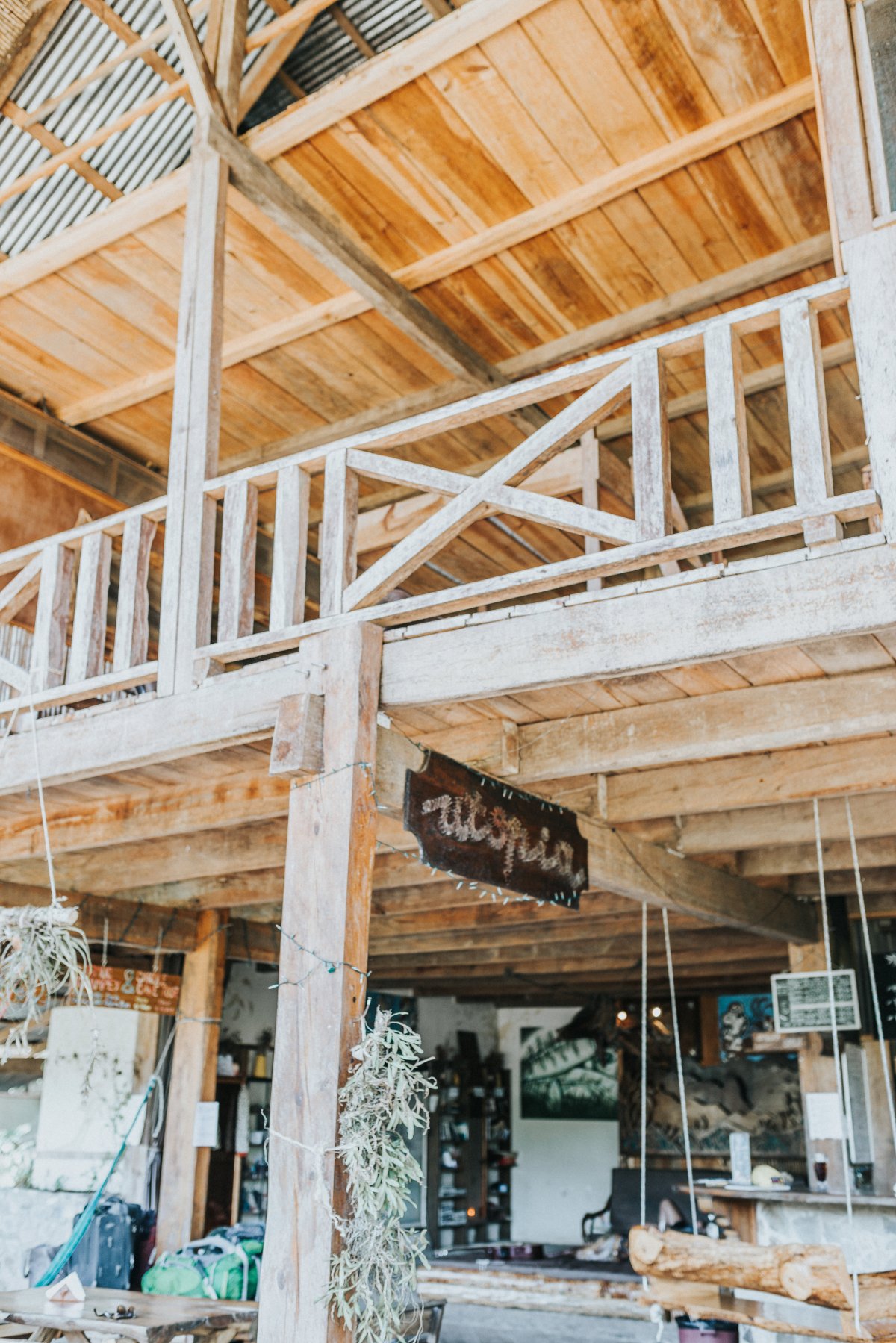 I’m sitting at a long, raw edge wood table. One designed for communal meals. Running along it’s center is a living garden. Plants grow out of it where centerpieces would be. Across the table, I can see Utopia Hostel’s bar. Wooden swings support coffee-drinkers and afternoon readers. Signs for yoga and chocolate tours adorn the walls. Looking up, I can see the balcony above that hosts an open air dormitory, and somewhere up there, is our bedroom nook. Behind me, and all around the open common area under Utopia’s roof, are mountains. Lush, green, tropical jungle. Oh, and Josh is here too. Quietly reading and soaking up the meditative and calming music that plays overhead. This is Guatemala.